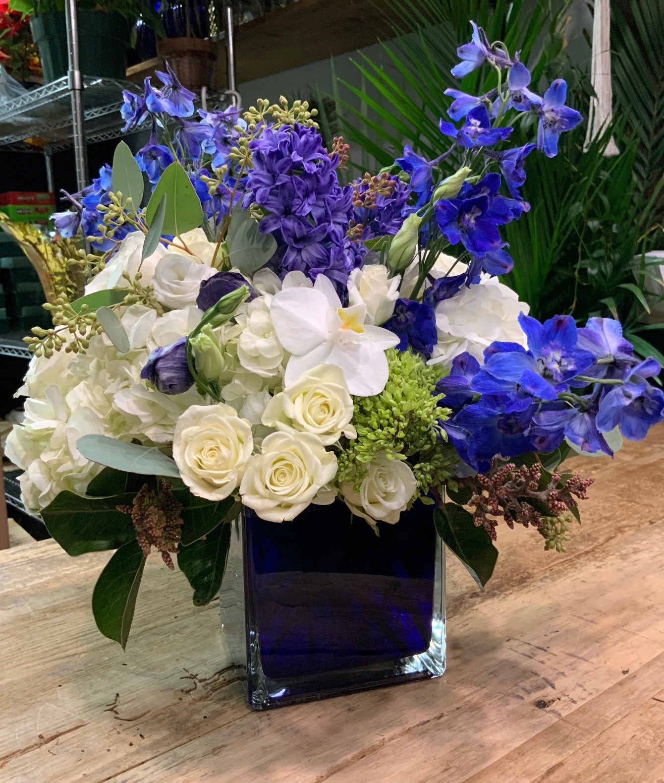 Featuring white orchids, blue delphinium, mini green hydrangea, white hydrangea, hyacinth and White lisianthus with mixed eucalyptus in a blue cube vase